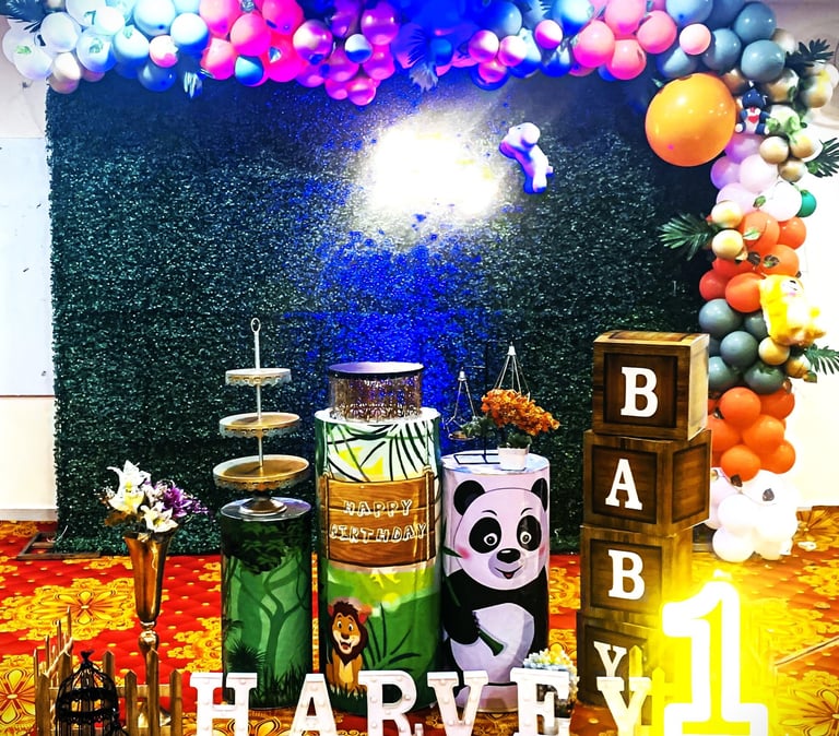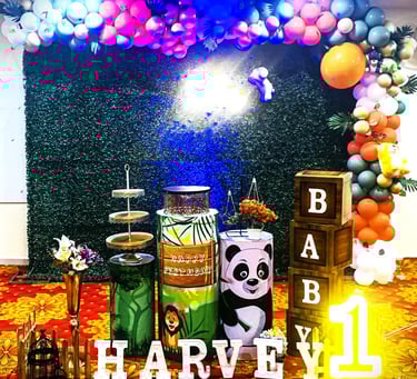 Immerse your guests in a lush, adventurous atmosphere with our panda & friends theme decoration. Featuring verdant greenery, animal print accents, and tropical foliage, this theme brings the wild outdoors inside.
