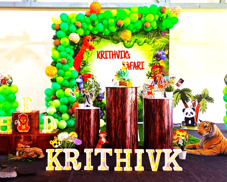 Transform your garden into a lush jungle adventure for your child's birthday with a Jungle Theme decoration! Fill the space with vibrant greenery, hanging vines, and inflatable jungle animals. Use animal print tableware, tropical foliage centerpieces, and jungle-themed banners to create an immersive and wild celebration.