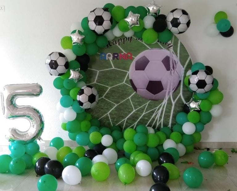 Turn the venue into a soccer field with green turf-like & soccer ball balloons, and goalpost banners for an authentic sports atmosphere.