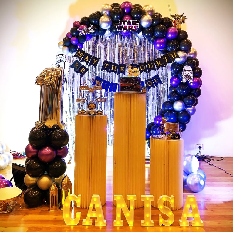 Elevate your celebration with our striking black and golden balloon star wars ring decoration. Combining the sophistication of black with the opulence of gold, this stunning arrangement creates a luxurious ambiance.