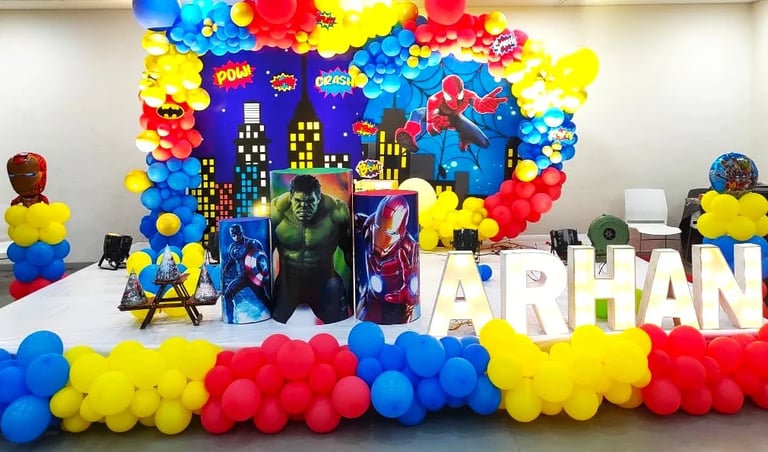 Elegant balloon arrangements for a Birthday Bliss decoration. Make your party look stunning and unforgettable! Transform your celebration into a visual delight with our exquisite Avenger-themed decoration.