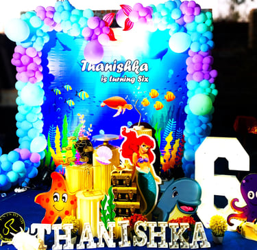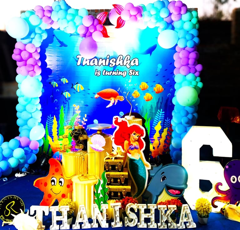 Transform your party into an underwater paradise with our enchanting mermaid theme decorations, featuring shimmering balloon arches, seashell accents, and magical lighting to create an unforgettable experience.